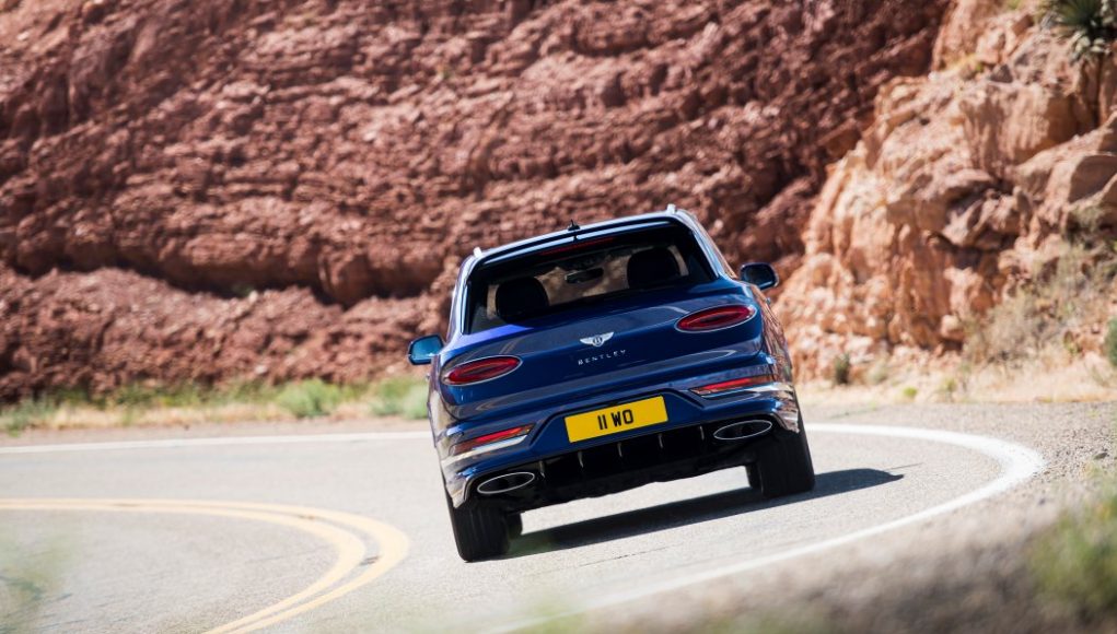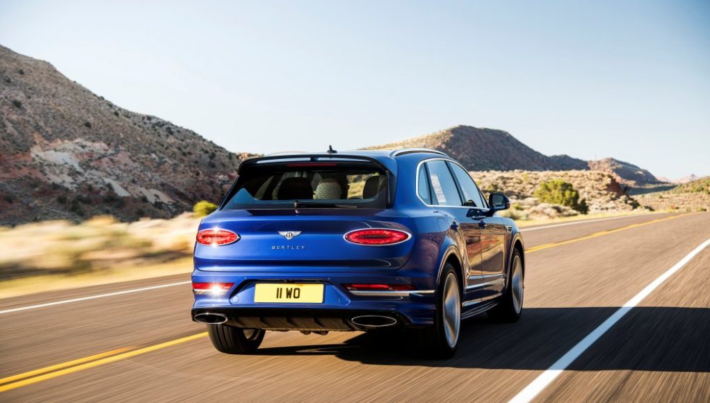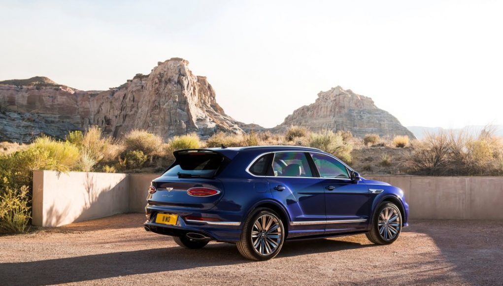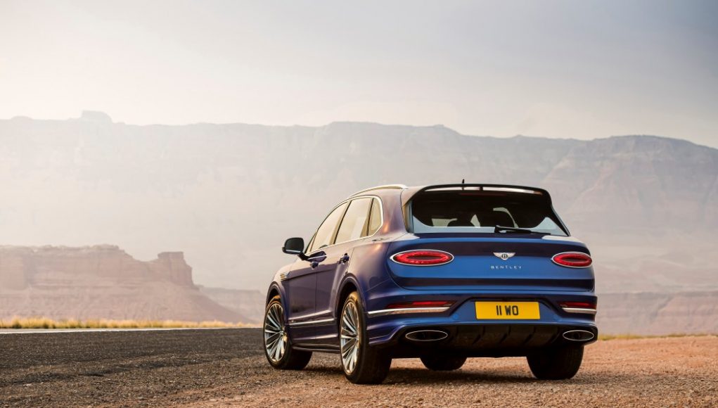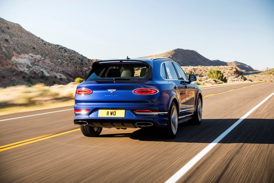 Para igualar los elevados niveles de rendimiento, el Bentayga Speed ​​luce un aspecto exterior decidido. Los faros de tinte oscuro, los faldones laterales del color de la carrocería, los parachoques delanteros y traseros únicos y un spoiler alargado y llamativo en el portón trasero caracterizan las credenciales de rendimiento del Speed. Las rejillas del parachoques y del radiador de tinte oscuro, un diseño exclusivo de llantas de 22 pulgadas disponible en dos acabados (pintado y tinte oscuro) y el distintivo de Speed ​​se suman a las señales de diseño deportivo. En la parte trasera, los acabados de escape tienen ahora el diseño ovalado que significa un tren motriz W12. Las luces traseras en tonos oscuros completan la firma exterior Speed.