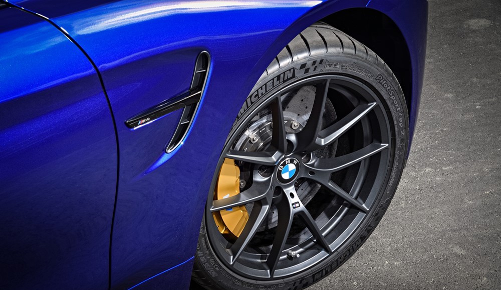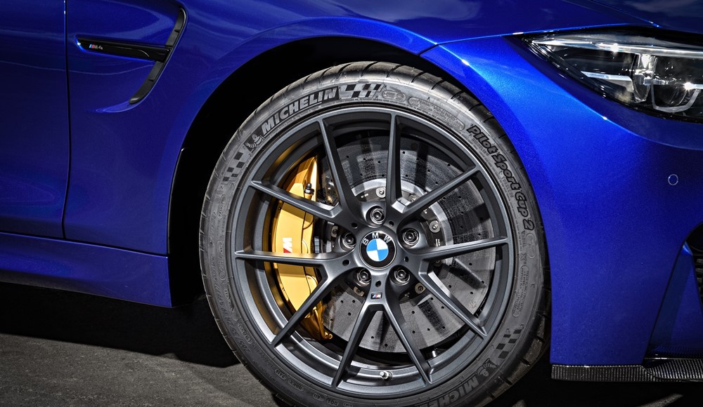 También las llantas de aleación ligera están orientadas al circuito (delante: 9J x 19 pulgadas; detrás: 10J x 20 pulgadas). Se han diseñado en exclusiva para el BMW M4 CS y van acompañadas de serie de neumáticos Michelin Pilot Sport Cup 2 (delante: 265/35 R 19; detrás: 285/30 R 20). Estos neumáticos semi-slick, homologados también para su uso en carretera, aseguran un agarre imbatible y una estabilidad lateral inmejorable a alta velocidad en el circuito, así como una tracción óptima al salir de las curvas cerradas. El BMW M4 CS también puede solicitarse con neumáticos de carretera Michelin Pilot Sport sin coste adicional.