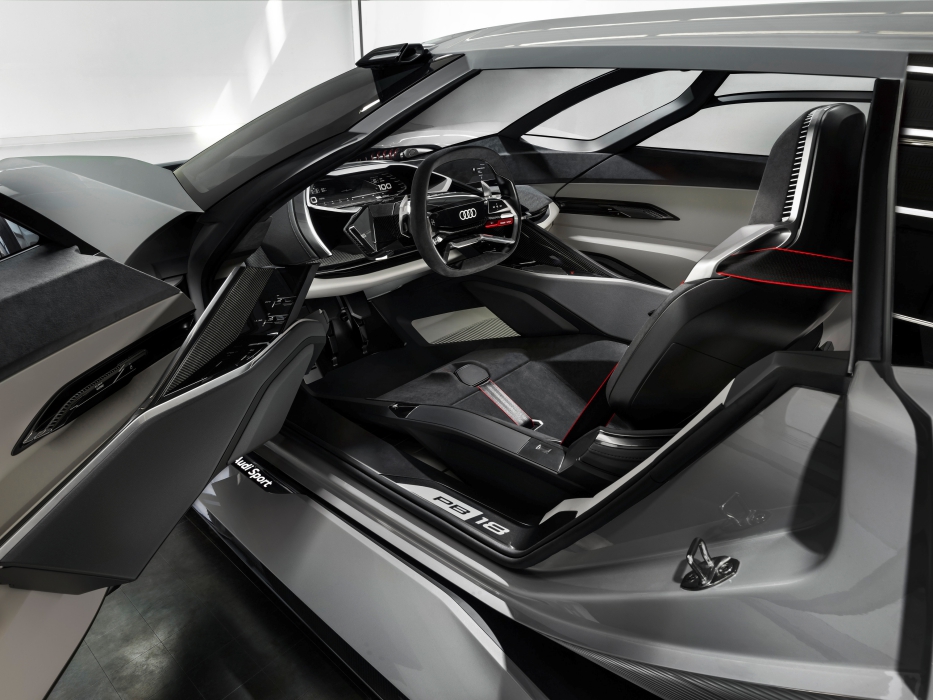Gael Buzyn, Director del estudio de diseño de Audi en Malibú, donde ha nacido el Audi PB18 e-tron, describe los elementos más importantes en las especificaciones: “Queremos ofrecer al conductor una experiencia que únicamente encontraría en un coche de carreras, como el Audi R18. Por ello desarrollamos el interior en base a la posición central del conductor. Sin embargo, nuestro objetivo era dotar al PB18 e-tron de un alto grado de versatilidad para uso diario, no solo para el conductor, también para un posible pasajero”.