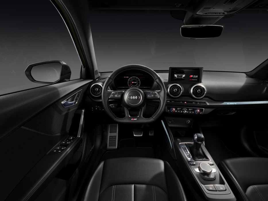 En el interior, donde abundan los tonos oscuros, se utiliza un nuevo material en los paneles de las puertas, mientras que el techo está acabado en color negro, y el salpicadero cuenta con inserciones en aluminio mate cepillado. Los pedales y el reposapiés son de acero inoxidable y las molduras de los umbrales de las puertas incluyen iluminación e incorporan el logotipo S. La pantalla muestra una animación específica S cuando se pone en marcha el motor. Como alternativa a la combinación de tela y cuero en la que van tapizados los asientos deportivos de serie, Audi ofrece la posibilidad de elegir un tapizado para los asientos en cuero Nappa fina, o bien la tapicería en microfobra Dinamica, que sustituye a la Alcantara. El amplio espacio para los pasajeros o la capacidad del maletero se mantienen inalterados: en función de la posición del respaldo de los asientos traseros, el volumen de carga puede variar entre 355 y 1.000 litros.