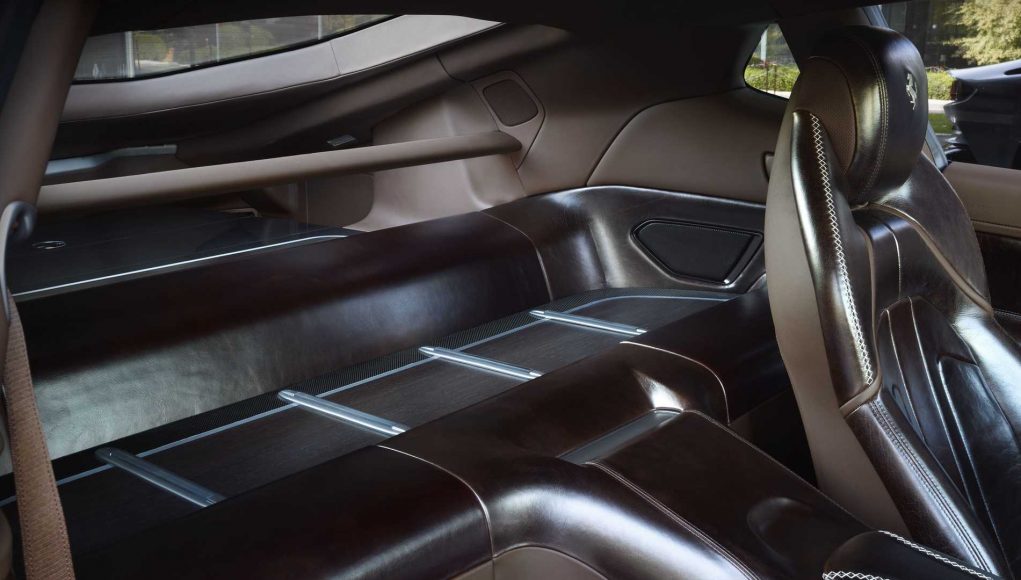 La solución adoptada en la forma del habitáculo crea un efecto similar al de un par de arcos que se extienden longitudinalmente, desde el pilar A hasta el spoiler trasero. El volumen trasero del mismo se ha ahuecado para crear un canal aerodinámico cuya salida queda oculta por la banda trasera negra debajo del spoiler. Esta moderna reinterpretación, tan querida por Ferrari, de los contrafuertes, conecta el automóvil con los rasgos estilísticos característicos del Cavallino Rampante, típicos tanto de la tradición GT como de los deportivos de la marca, como el 599 GTB Fiorano. Para aligerar visualmente el habitáculo, el color negro del techo hace de puente entre el parabrisas y la luneta trasera, elevada sobre la superficie del portón trasero para acompañar el flujo de aire.