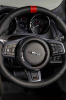 La consola central incluye también nuevos acabados para diferenciar las distintas versiones: el acabado F-TYPE exhibe una sencilla terminación de estriado en aluminio, el R-Dynamic dispone del acabado Delta en aluminio que añade un toque deportivo al interior. Las versiones Bandera a Cuadros presentan una acabado en aluminio pulido oscuro y el modelo R se diferencia del resto por su acabado Linear Vee con la emblemática `R´ grabada que destaca en la superficie. Como novedad, está disponible como opción en toda la gama un embellecedor de fibra de carbono para la consola.
