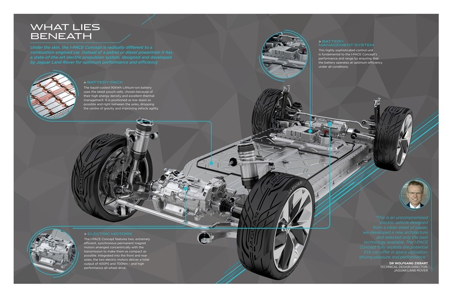 “Es un vehículo eléctrico que se ha diseñado partiendo de cero sin renunciar a ninguna prestación. Hemos desarrollado una nueva arquitectura y utilizado la mejor tecnología a nuestra disposición. El I-PACE Concept aprovecha al máximo el potencial de los vehículos eléctricos en lo relativo a uso del espacio, experiencia de conducción y rendimiento”. Wolfgang Ziebart, Technical Design Director de Jaguar Land Rover.