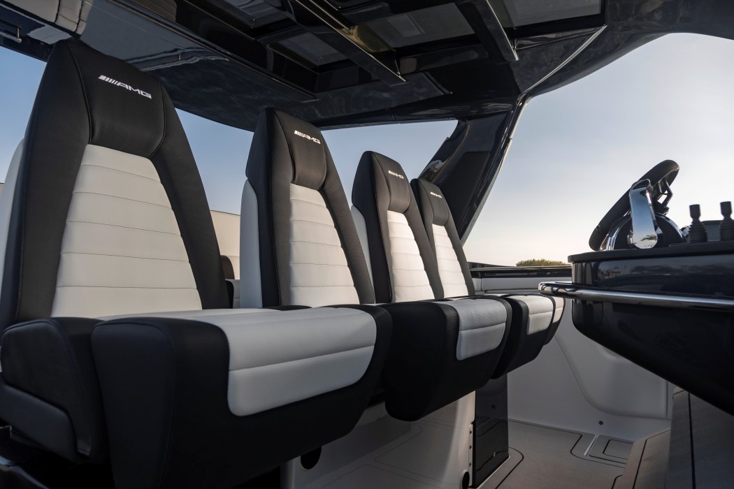 El impresionante exterior del barco en negro metálico se complementa con un patrón de diamantes AMG en dorado. En el interior, el cuero del camarote comparte una distintiva combinación de color mediterráneo con el AMG G 63 Cigarette Edition en beige macchiato y azul oscuro. Esta minuciosa atención al detalle continúa bajo cubierta. La disposición en el nivel inferior del barco se presenta con un gran sofá, un armario que oculta el frigorífico, almacenamiento adicional y un televisor. A continuación se encuentra una cama California de tamaño “King Size” y un gran cuarto de baño cerrado con ducha separada. La tapicería de cuero de primera calidad en la cabina está confeccionada a mano, mientras la cubierta superior está tapizada en un material capaz de reflejar hasta el 30 por ciento del calor absorbido. Esta tecnología hizo posible elegir un color más oscuro en la cubierta para conseguir una atmósfera más confortable y lujosa. La hermosa atención por el detalle también es evidente en el riel de agarre continuo de acero inoxidable redondeado que recorre toda la longitud del barco. Tres ventanas a cada lado del casco proporcionan una vista al mar desde el interior de la cabina, mientras que los tragaluces tanto en el techo duro como en la cabina crean una gran sensación de luminosidad y espacio en su interior. Las persianas de los tragaluces se pueden cerrar si se desea tener privacidad.