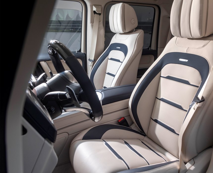 El interior del Clase G, por primera vez al igual que el interior de la embarcación, presenta una exclusiva tapicería de napa bicolor beige macchiato y azul oscuro, así como un volante AMG performance en fibra de carbono con napa azul oscuro basado en el interior de la embarcación. Las exclusivas alfombrillas y la icónica manilla de la puerta del Clase G incluyen la inscripción Cigarette.