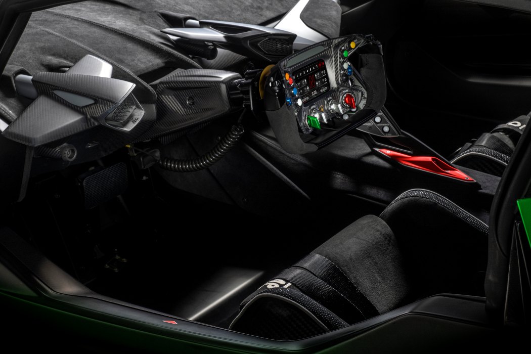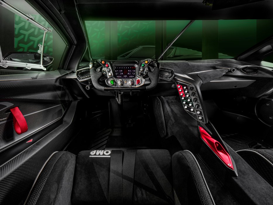 El diseño del volante multifunción con pantalla se inspira en los volantes de los monoplazas de F1 para ofrecer la máxima ergonomía y transmitir sensaciones puras; el exclusivo asiento OMP, con homologación FIA, con carcasa de fibra de carbono abraza al piloto para brindarle confort, seguridad y estabilidad.