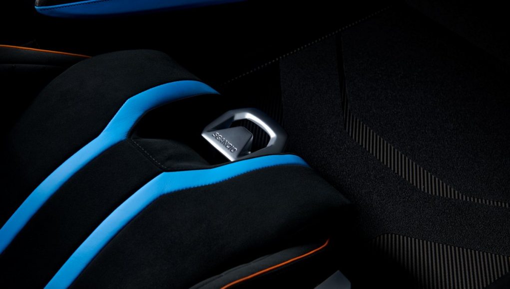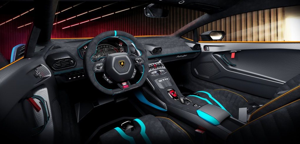 El interior del Huracán STO es un reflejo de la ligereza de su exterior, con uso intensivo de elementos de fibra de carbono en todo el habitáculo, incluidos los asientos deportivos en fibra de carbono. Tapicería de Alcantara combinada con Lamborghini Carbonskin, alfombrillas en fibra de carbono y paneles ligeros para las puertas confeccionados por completo en fibra de carbono con un sencillo mecanismo de tira de cierre. Una jaula antivuelco con cinturones de seguridad de cuatro puntos y un maletero delantero de nuevo diseño para guardar el casco, subrayan el ADN de competición del Huracán STO. El arco trasero, desarrollado en cooperación con nuestro socio técnico Akrapovič, está confeccionado con aleaciones de titanio de alta calidad. Es un 40% más ligero que los arcos traseros convencionales de acero inoxidable.