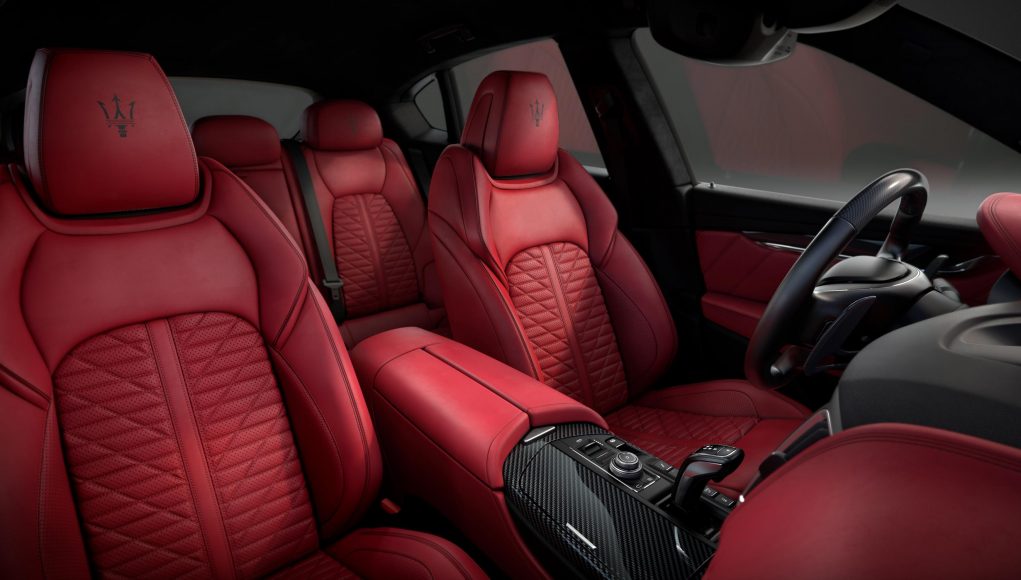 Una vez en el interior del nuevo Levante Vulcano, su equipamiento sigue respirando elegancia y deportividad en cada uno de sus acabados. Los asientos deportivos, de cuero natural Pieno Fiore regulables eléctricamente con memoria, calefactables y ventilados, con el logo del Tridente cosido en contraste sobre el reposacabezas, pueden ser pedidos en negro con costuras en contraste de color rojo o viceversa, aumentando el carácter volcánico del modelo.