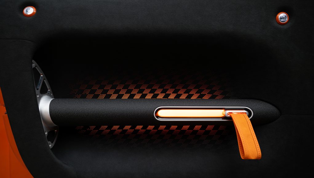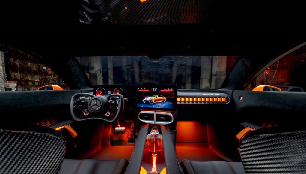 Para ahorrar peso, los asientos envolventes de fibra de carbono formados individualmente en la parte trasera, incluidos los cojines, están completamente integrados en el mamparo trasero del automóvil. El techo no tiene techo, lo que ahorra peso y deja al descubierto la estructura de fibra de carbono. Los paneles de las puertas con tubos ligeros y trabillas de cierre naranjas completan el aspecto general innovador y deportivo. El diseño de la bandera a cuadros del tejido retroiluminado en color es una referencia más al automovilismo. Los puntos de fijación de las puertas están revestidos con pequeños botones de aluminio mecanizado. Con un elegante acabado en la imagen, lucen el escudo de armas de AMG y se acentúan con el color de la pintura exterior.