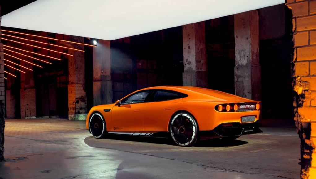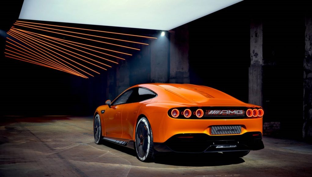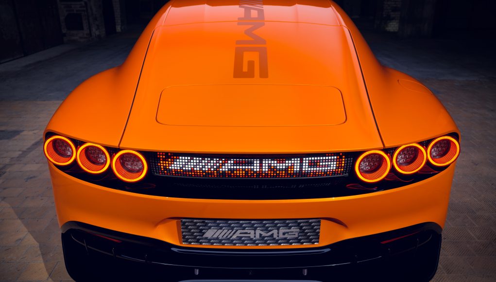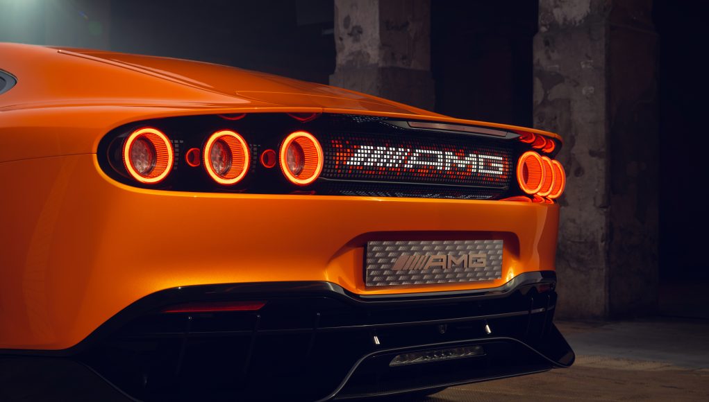 A vista de pájaro, el invernadero aerodinámico se estrecha hacia atrás, lo que permite hombros particularmente anchos. Los pasos de rueda traseros también fluyen orgánicamente desde los flancos. Otro elemento de diseño en la parte trasera es el amplio difusor de carbono expuesto, que se extiende profundamente hacia abajo a ambos lados. Diseñado para garantizar la estabilidad de la parte trasera a altas velocidades, su forma recuerda a la del AMG ONE.