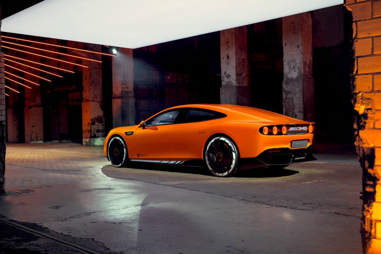 La parte trasera dinámica, con su borde aerodinámico en ángulo pronunciado y seis luces traseras circulares de color rojo intenso, forma una identidad de vehículo única. Las luces y el MBUX Fluid Light Panel situado en el centro están enmarcados por un hueco alargado con paredes laterales cónicas para crear una sensación de profundidad especialmente impresionante. El freno de aire activo está perfectamente integrado en la parte trasera.