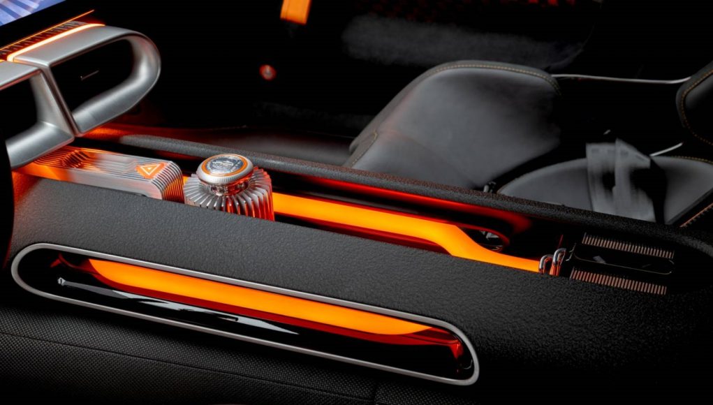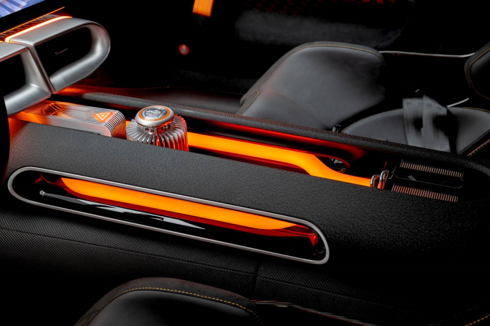 Una característica particularmente distintiva del interior son las extrusiones expuestas de la carrocería en blanco alrededor de la consola central, con tubos naranjas iluminados. Su aspecto crea una asociación instintiva con los cables de alto voltaje. Otra característica destacada es el elemento de diseño en la consola central, que adopta la forma del escudo de armas AMG. De este modo, el CONCEPT AMG GT XX expresa sus máximas prestaciones eléctricas con características de alta tecnología mecanizadas en metal macizo e iluminadas.
