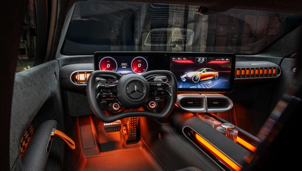 El volante es similar al del AMG ONE, con su forma casi rectangular y dos puntales horizontales a cada lado inspirados en el automovilismo. Las levas del volante sirven para controlar la recuperación. Una pantalla en la columna de dirección utiliza diferentes códigos de color a través de ocho LED para señalar el estado de carga (azul), la recuperación y el rendimiento actual (rojo). Además, hay dos botones redondos AMG en el volante que controlan otras funciones y muestran las opciones con iconos de colores.