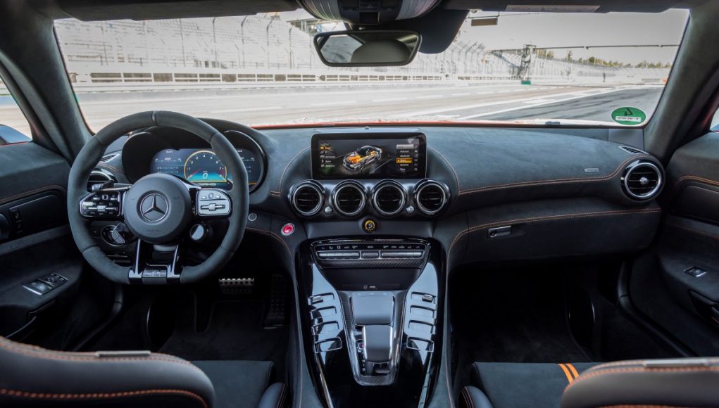 El concepto interior subraya la posición destacada del AMG GT Black Series. El cuero exclusivo napa se combina con la deportiva microfibra DINAMICA en color negro y con costuras de adorno en color de contraste naranja. El portainstrumentos y los paneles de las puertas de construcción ligera y nuevo diseño —en lugar de asideros equipan ahora tiradores de lazo—, están revestidos con microfibra DINAMICA en negro. Costuras adicionales en color de contraste naranja, elementos de adorno en fibra de carbono negro mate y el paquete AMG Night interior añaden también toques llamativos. Los asientos AMG tipo «baquet» de fibra de carbono (no disponibles para EE.UU., Canadá y China) combinan un peso reducido con una sujeción lateral óptima. En EE.UU., Canadá y China, el Black Series va equipado de serie con asientos.