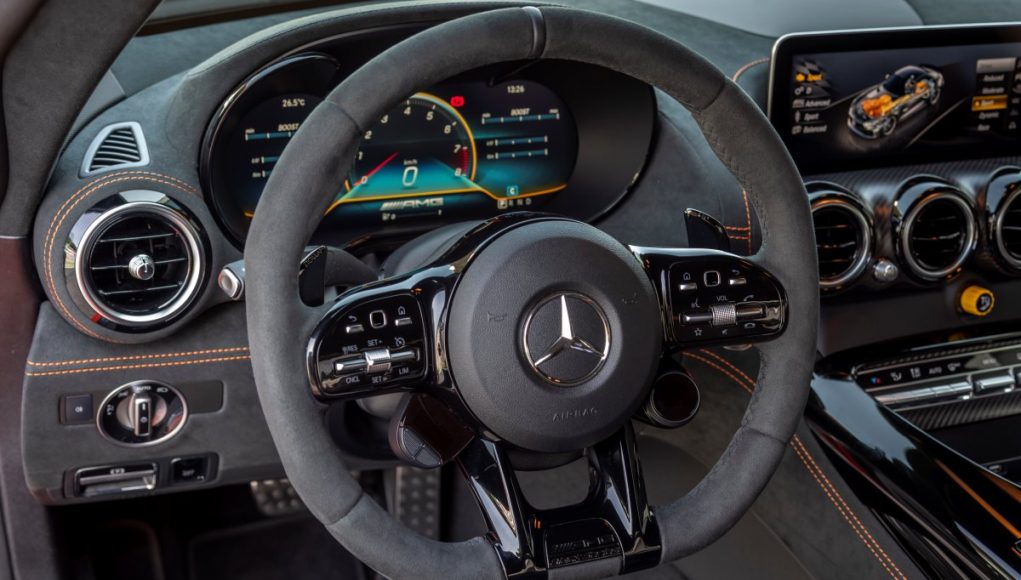El nuevo volante AMG Performance procede asimismo de la familia AMG GT. Se caracteriza por su diseño deportivo, la sección inferior plana, el aro de contornos acusados y el manejo intuitivo. El aro del volante está forrado íntegramente en microfibra DINAMICA y la placa del volante lleva, además del logotipo AMG, el distintivo exclusivo «Black Series». Las levas de cambio de aluminio integradas en el volante hacen posible una conducción aún más deportiva, con cambios de marcha manuales. Con los botones Touch Control integrados es posible controlar de forma intuitiva —mediante movimientos de barrido horizontales y verticales del dedo— las informaciones que se muestran en el cuadro de instrumentos y en el visualizador de medios.
