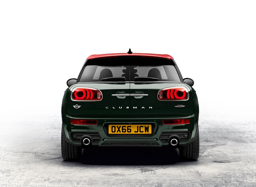 En materia de placer de la conducción, confort y funcionalidad se pueden satisfacer con atractivas opciones del programa equipamientos especiales disponibles para MINI Clubman. Estos permiten crear un diseño con un estilo muy personal del exterior así como del interior gracias a la gran selección disponible de pinturas exteriores, molduras y superficies interiores. Entre las ofertas exclusivas para los modelos John Cooper Works se encuentran la pintura de la carrocería en la variante Rebel Green, con la opción de la pintura en contraste de color rojo para el techo y las carcasas de retrovisor así como las franjas de capó en los colores rojo o negro.