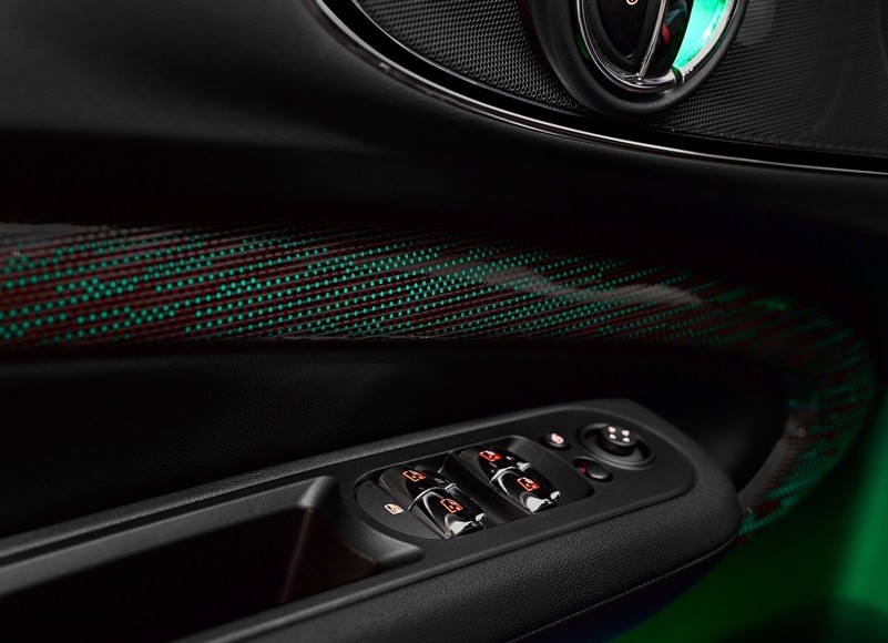 Con la opción MINI Yours Interior Styles disponible en tres variantes se subraya el marcado diseño de los revestimientos de las puertas con molduras decorativas con iluminación indirecta. El paquete de luces con alumbrado ambiente e interior LED crea también un ambiente muy expresivo. Junto con el equipamiento opcional del paquete MINI Excitement se puede cambiar de color sin etapas y se completa además con una presentación de luces al abrir y cerrar el vehículo. Activando la llave con mando a distancia se proyectará el logotipo de MINI en el suelo durante 20 segundos, respectivamente, con la ayuda de una fuente de luz adicional en el retrovisor exterior.