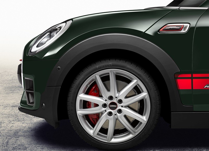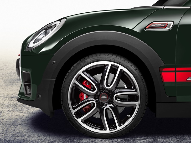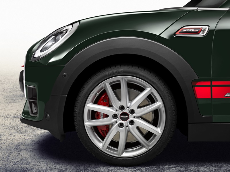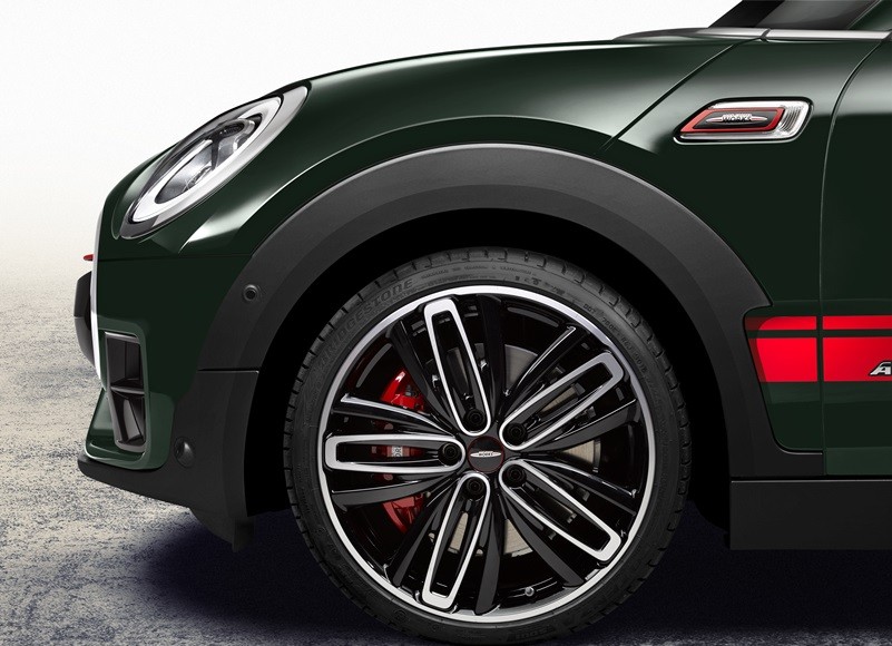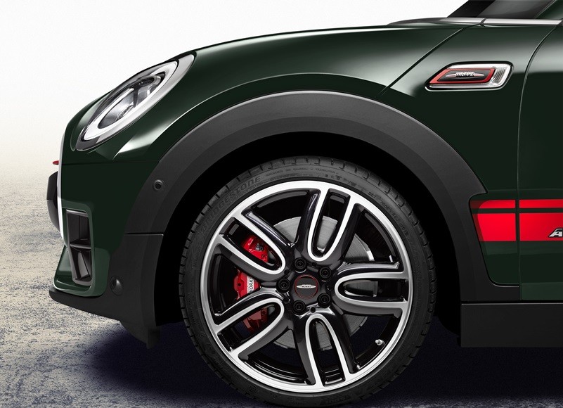 El tren de rodaje deportivo de serie del nuevo MINI John Cooper Works Clubman presenta además un diseño especialmente conciso de los sistemas de amortiguación y suspensión. Un sistema de frenos deportivo especialmente diseñado para los modelos John Cooper Works consigue que no solo los valores de aceleración se correspondan al carácter orientado a un extraordinario rendimiento del vehículo. Los frenos de disco con pinzas de 4 pistones diseñados en colaboración con el fabricante especial Brembo garantizan también una potencia de deceleración elevada y homogénea incluso en circuito.. Las pinzas de freno están pintadas de color rojo y llevan el logotipo John Cooper Works. Al equipamiento de serie pertenecen además las nuevas llantas de aleación ligera John Cooper Works de 18 pulgadas disponibles exclusivamente para el MINI John Cooper Works Clubman Works en la ejecución Black Grip Spoke. Opcionalmente se encuentran disponibles llantas de aleación ligera John Cooper Works en la variante Grip Spoke en color plata de 18 pulgadas así como con diseño Course Spoke 2-tone de 19 pulgadas.
