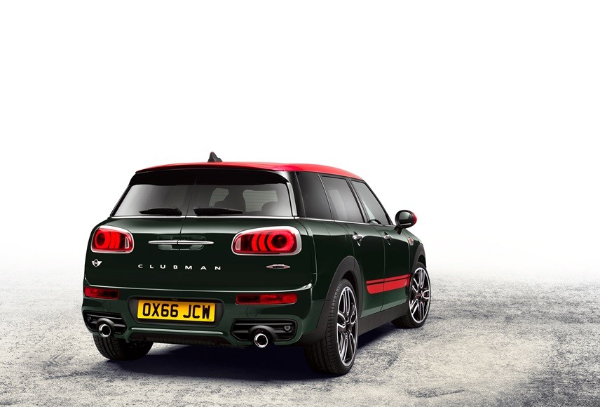 El diseño exterior del nuevo MINI John Cooper Works Clubman interpreta el concepto automovilístico lleno de tradición del Shooting-Brake no solo de forma actual sino especialmente deportiva. También son ya inconfundibles las proporciones del último y también mayor atleta de alto nivel de John Cooper Works con una longitud de 4253, un ancho de 1800, una altura de 1441 y una batalla de 2670 milímetros. La dinámica silueta alargada, , la prolongada línea del techo y la zaga recta con sus características Split Doors lo convierten en una figura extraordinaria dentro de la clase Premium compacta. Para conseguir una individualización aún mayor se encuentran disponibles, entre otros, la pintura de la carrocería de color Rebel Green, la pintura en contraste de color rojo para el techo y las carcasas de retrovisor exclusivas para los modelos John Cooper Works así como las franjas del capo en los colores rojo o negro.