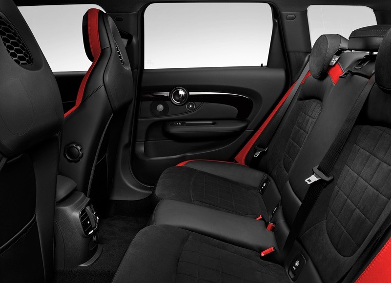 Cuando se mira el interior del nuevo MINI John Cooper Works Clubman llaman la atención sus cinco plazas apropiadas para personas adultas, gran cantidad de espacio para el equipaje así como elementos de mando e indicación de diseño moderno. Las cuatro puertas laterales permiten subir con comodidad, la capacidad del maletero detrás de las Split Doors se puede aumentar abatiendo el respaldo del asiento trasero divisible opcional en relación de 40:20:40 de 360 a 1250 litros. Su elaborada imagen Premium, la comodidad del espacio y la inteligente versatilidad se combinan en el nuevo MINI John Cooper Works Clubman con un ambiente específico del modelo en el estilo de un automóvil deportivo.