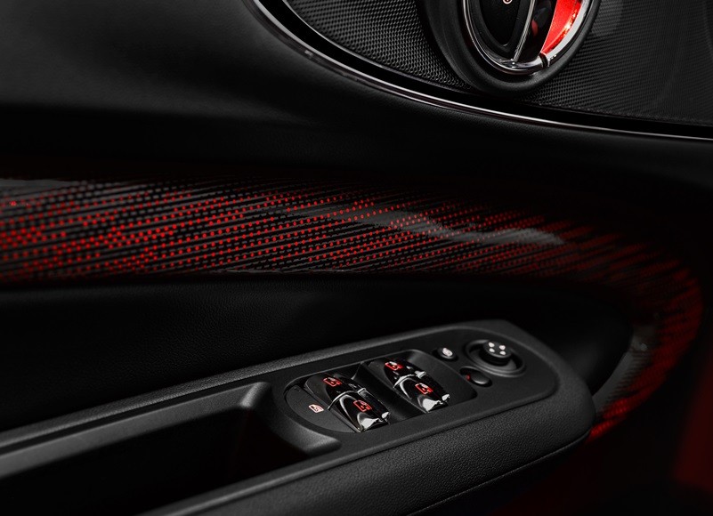 El equipamiento de serie incluye asientos deportivos John Cooper Works con apoyacabezas integrados y acabados en Dinamica y tela de color Carbon Black. Opcionalmente también se encuentra disponible la variante de equipamiento Dinamica y cuero Carbon Black con aplicaciones rojas. A conseguir la sensación de carrera que se disfruta en todo momento contribuyen también el volante de cuero John Cooper Works multifunción, las molduras de puerta John Cooper Works, la palanca de cambios John Cooper Works, pedales de acero inoxidable con apoyo para pie del conductor así como las indicaciones del puesto de conducción con esferas oscuras. El interior del techo de color antracita, las molduras interiores de diseño Grey Chequered y las notas rojas que se encuentran no solo en las superficies de los asientos sino también en la corona del volante, la palanca de cambios y en el instrumento central subraya el carácter deportivo y exclusivo del interior.