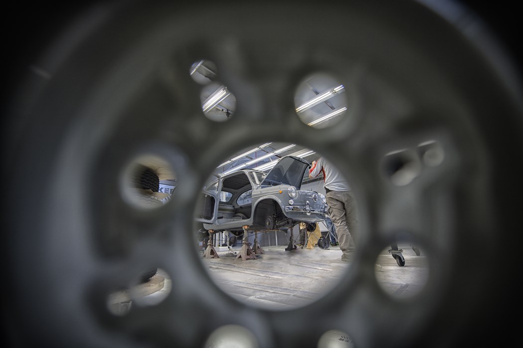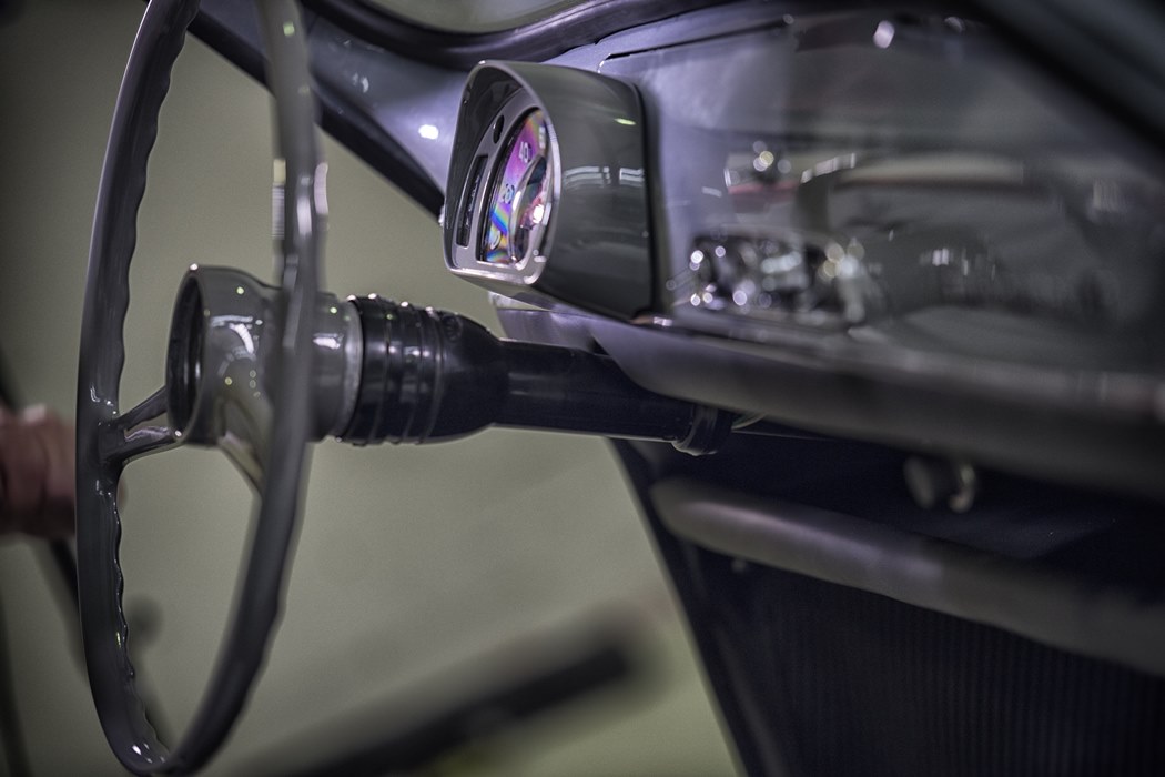 - Capota manual y volante original: Entre las piezas del coche, destaca su techo abrible de accionamiento manual, que se ha restaurado completamente también de forma artesanal, incluso reconstruyendo las piezas que faltaban. El volante y el pulsador de bocina son los originales.