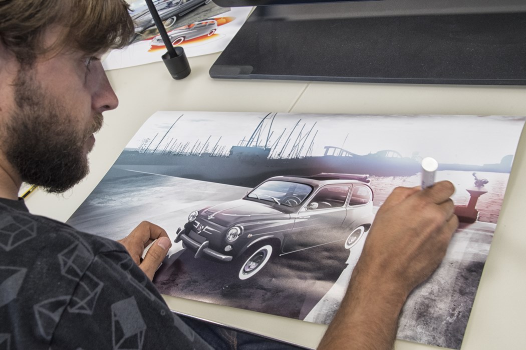 - 50 metros de tejido ‘pata de gallo’: Para este coche se han fabricado unos 50 metros de tejido exclusivo, que pretende ser “una alegoría al famoso gráfico ‘pata de gallo’ con el blanco y el negro, y que nos recuerda a tiempos pasados”, explica Font.