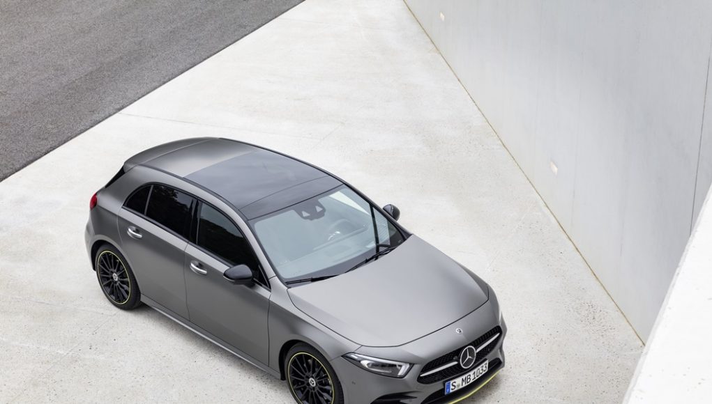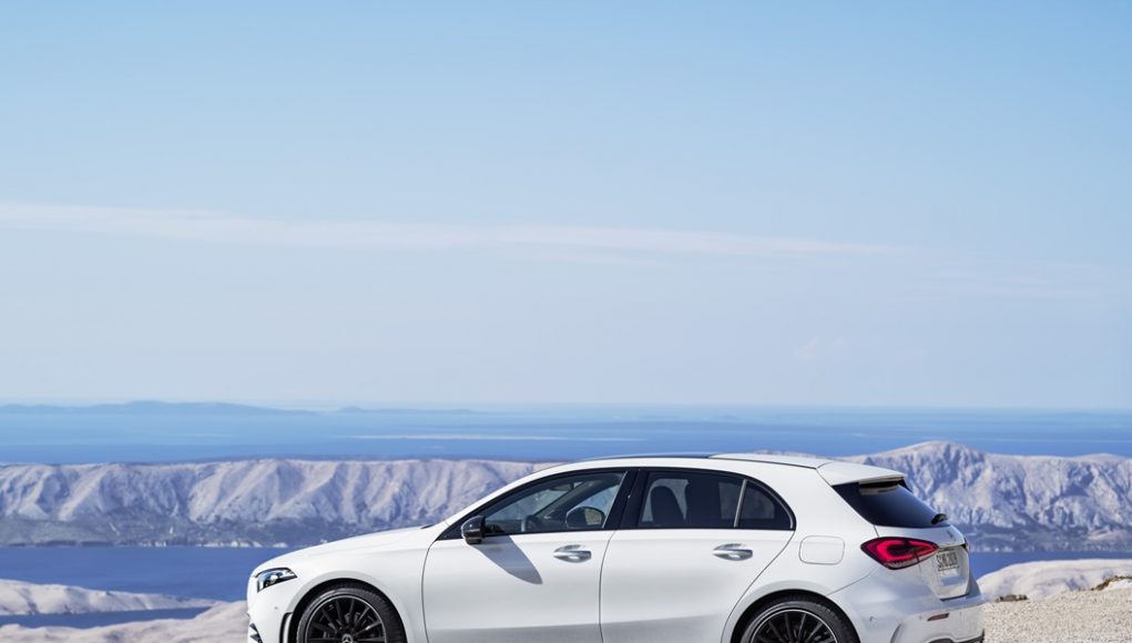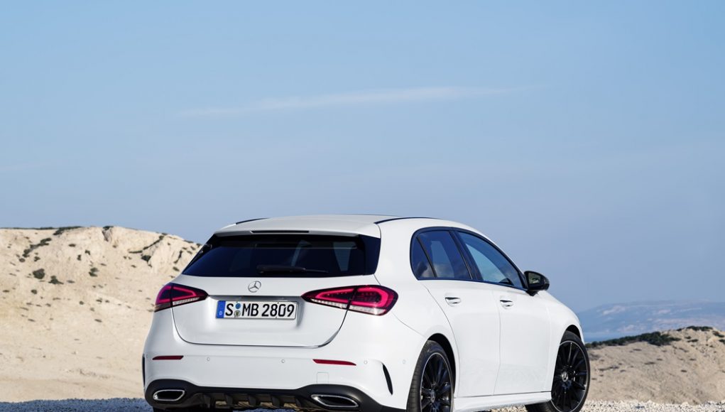 La mayor distancia entre ejes y una línea de carácter en los laterales aumentan visualmente la longitud del vehículo. A diferencia del modelo precedente, el capó está más inclinado hacia adelante y destaca mejor la posición erguida del dinámico frontal. Los pasarruedas más amplios, para llantas de entre 17 y 19 pulgadas, acentúan la deportividad de la nueva Clase A y transmiten una mayor sensación de aplomo. La baja altura del habitáculo, así como las ópticas integradas en el parachoques trasero, de estructura modular y dividido en dos secciones, acentúan visualmente la anchura de la zaga, a la vez que resaltan la zona de los hombros. Las delgadas luces traseras, divididas en dos partes, aseguran una presencia emocional y fascinante.
