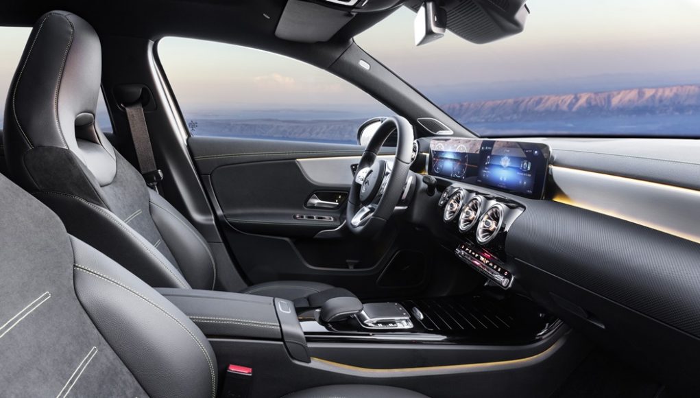 El habitáculo de la nueva Clase A propone una nueva definición del vanguardismo y la modernidad. Mercedes-Benz abre una vía completamente nueva de diseño y revoluciona desde el interior la categoría de turismos compactos con una nueva sensación de amplitud. Una de las claves de la singular arquitectura es la configuración vanguardista del tablero de instrumentos: por primera vez se ha renunciado plenamente a una visera por encima del puesto de conducción. Gracias a esta modificación, el cuerpo básico del tablero de instrumentos con su forma de ala se extiende sin solución de continuidad entre las dos puertas delanteras. Un aspecto destacado son los difusores de ventilación de estilo deportivo en efecto turbina.
