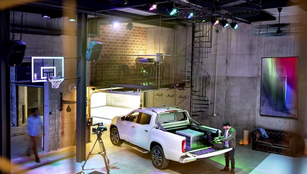 La anchura de la base de la caja de carga está dimensionada de modo que sea posible cargar un europalet en posición transversal entre los pasos de rueda. La Clase X es el único pickup mediano equipado de serie con iluminación de la superficie de carga. En la tercera luz de freno se integran elementos LED que iluminan la totalidad de la base de la caja de carga. Para el manejo se utiliza un interruptor en la consola central. La luz se apaga automáticamente en el momento en que se conecta el encendido. El equipamiento de serie de la base de la caja de carga incluye asimismo una caja de enchufe de 12 voltios para conectar equipos adicionales como, por ejemplo, un compresor.