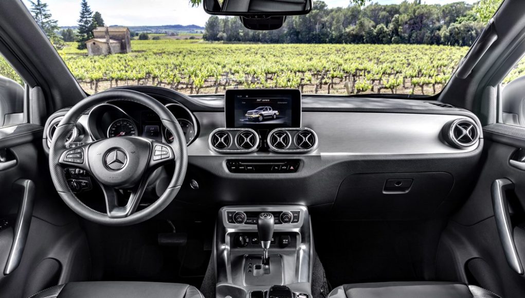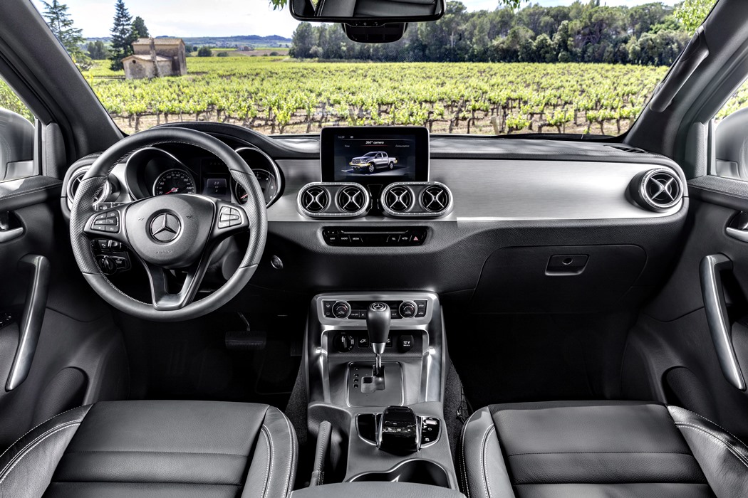 El habitáculo de la Clase X eleva a un nuevo nivel el confort y la impresión de valor en el segmento de las pickups medianos. El tablero de instrumentos dispone del elemento de adorno cóncavo típico de Mercedes, que abarca toda la anchura interior. Un detalle que constituye una novedad en esta categoría de vehículos. Este rasgo genera una agradable sensación de espaciosidad y libertad y transmite modernidad purista. Para la Clase X POWER se ofrecen tres versiones diferentes de los elementos de adorno: efecto pixelado negro mate, efecto aluminio con rectificado longitudinal y efecto madera veteada marrón mate. En armonía con esta impresión de alto valor, la sección superior del puesto de conducción presenta una superficie de símil de cuero ARTICO, a elección en negro o en marrón nuez. La nota deportiva la ponen los característicos difusores redondos de ventilación. En función de la línea de equipamiento elegida, los difusores son de color negro de alto brillo o silver shadow. Esto se traduce en un efecto táctil metálico de alto valor. En las líneas de equipamiento PROGRESSIVE y POWER, la consola central está engarzada por un llamativo marco de adorno de color silver shadow. También se emplea silver shadow en la ejecución de las manillas de gran formato en las puertas. El efecto táctil metálico se ve reforzado por el visualizador central exento conocido de la Clase V. En combinación con el sistema multimedia COMAND Online, la pantalla tiene 8,4 pulgadas de diagonal y, por lo tanto, es el mayor visualizador en el segmento. Gracias a una definición de 960 x 540 píxeles y a la tecnología de alto contraste IPS (In-Plane Switching) ofrece una imagen brillante, que aumenta especialmente la calidad de reproducción de las imágenes de la cámara de 360 grados y de los mapas de navegación.