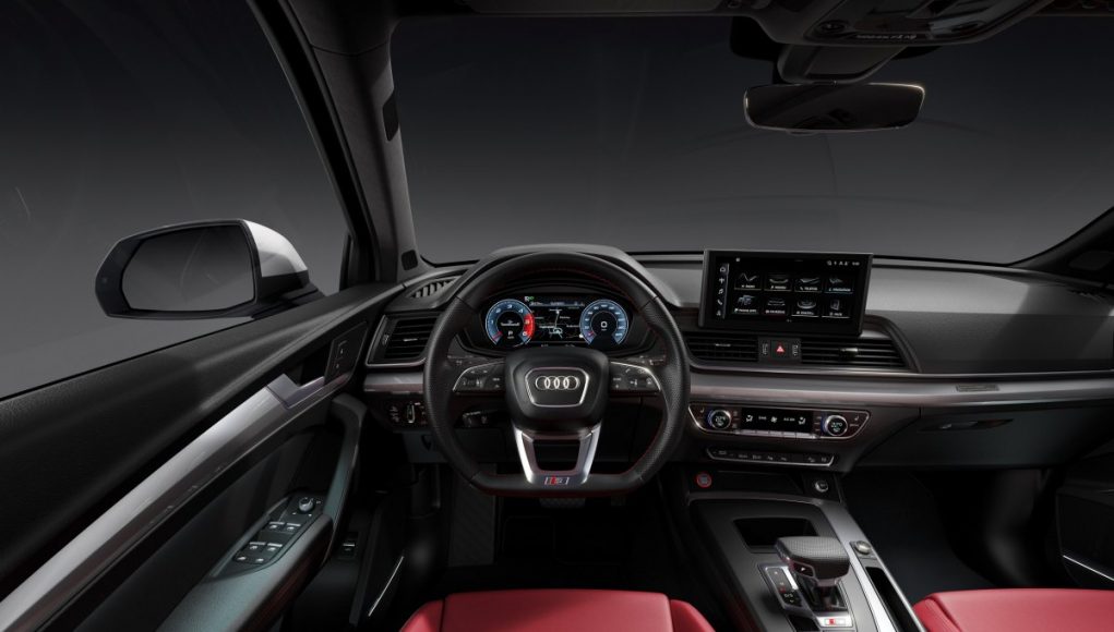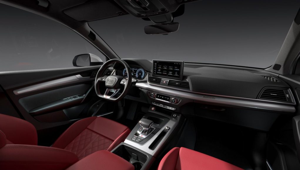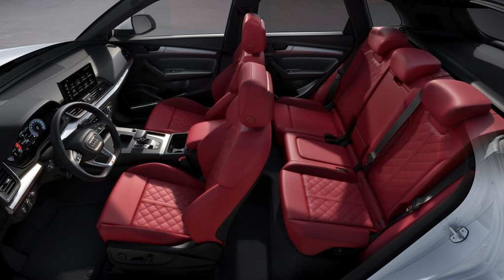 El SQ5 TDI presenta un interior con diseño en color negro o gris oscuro, con inserciones de aluminio iluminadas en los umbrales de las puertas que incluyen el logotipo S. Los asientos deportivos con ajustes eléctricos y el logotipo S grabado en relieve están disponibles tres variantes de tapicería. De serie combinan cuero y cuero sintético, mientras que opcionalmente se puede elegir entre una combinación de cuero y la microfibra Dinamica, fabricada principalmente a partir de material plástico reciclado, y que sustituye a la Alcantara. La tercera posibilidad, también opcional, es la tapicería en piel Nappa fina con patrón de rombos en color rojo magma. Tanto los asientos como el volante incluyen costuras en contraste. Los asientos pueden contar de forma opcional con funciones de masaje y ventilación. Las inserciones decorativas para el salpicadero son de aluminio cepillado, con varias alternativas disponibles, dos en carbono y una en acabado piano.