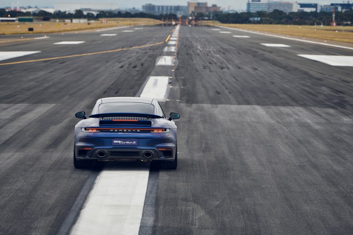 Aprovechando el descenso de tráfico aéreo, Porsche ha lanzado en Australia el Porsche 911 Turbo S en un evento celebrado en una pista del aeropuerto de Sídney.