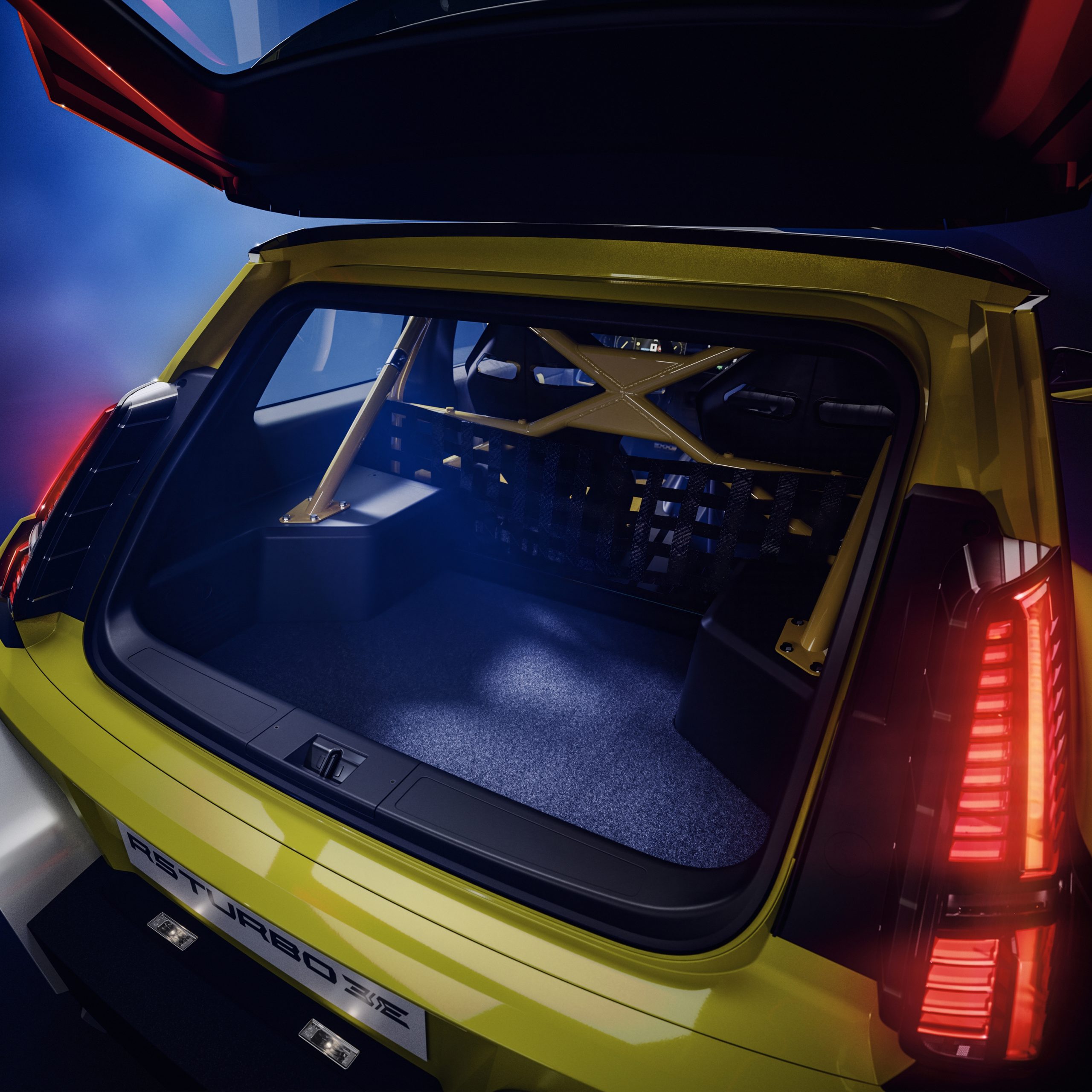 Renault 5 Turbo 3E, un modelo de dos puertas y dos plazas, esconde bajo sus aletas ensanchadas unas llantas de 20 pulgadas. En las ruedas traseras hay dos motores eléctricos y entre ellos se encuentra toda la electrónica de potencia, mientras que la batería se aloja bajo el piso. Esta arquitectura permite liberar un gran volumen de maletero para le equipaje (una propuesta única en un vehículo deportivo de este tipo) y bajar el centro de gravedad.