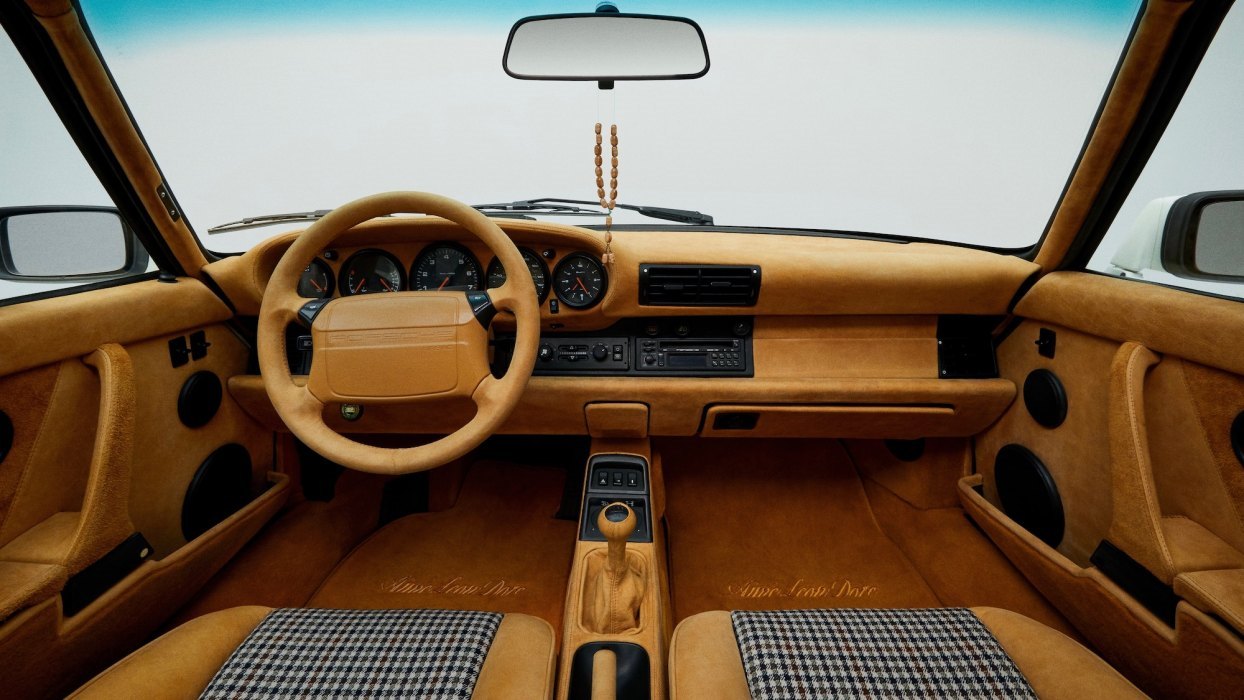 La parte principal de la restauración es un interior totalmente personalizado, con cuero Schott girasol y tejido de pata de gallo Loro Piana, los mismos materiales que se destacan en la colección Otoño/Invierno 2020 de Aimé Leon Dore. Un cuero de grano fino cubre el salpicadero, el volante y los paneles de las puertas, mientras que el techo y la cubierta del techo solar están tapizados con piel vuelta.