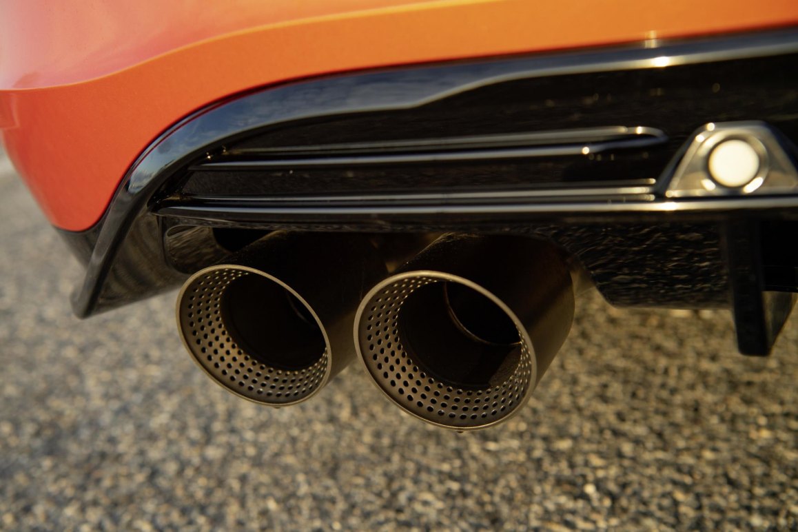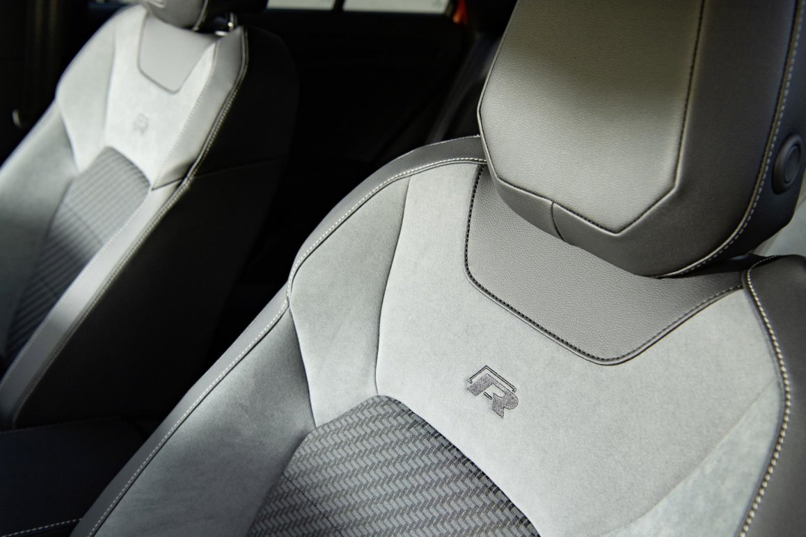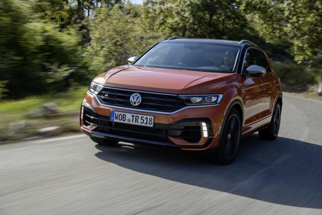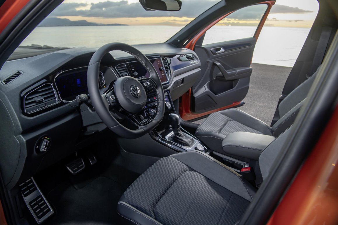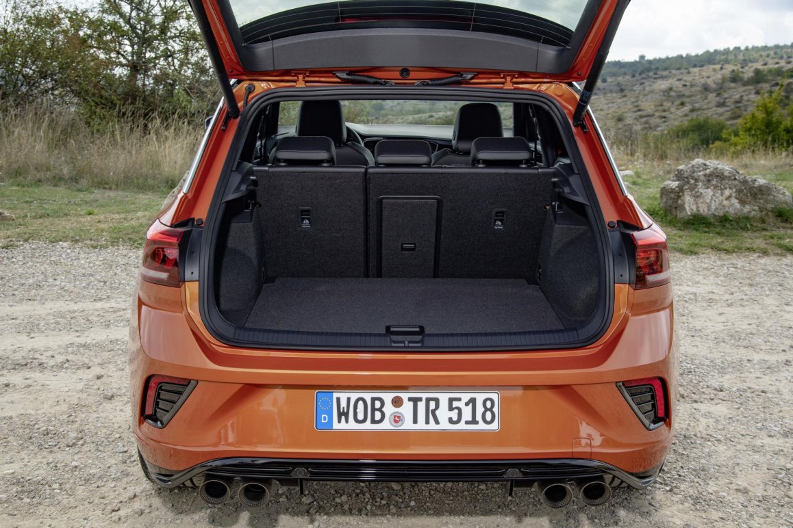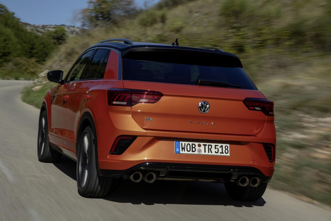 Parachoques específico R con luz diurna, tomas de aire en acabado negro brillante y el logo R en la parrilla del radiador negra son algunas de las características típicas de la familia Volkswagen R. Otros elementos son las carcasas de los retrovisores exteriores en cromo mate, las barras longitudinales de techo en plata anodizada y las llantas «Spielberg» de 18 pulgadas («Pretoria» de 19 pulgadas opcional). Los faros delanteros LED garantizan una iluminación perfecta de la carretera y la mejor visibilidad del vehículo. Las luces diurnas han sido integradas verticalmente en el parachoques delantero, que ha sido específicamente diseñado para el T-Roc R, que lo hacen inconfundible a distancia. Los grupos ópticos traseros LED son de color rojo oscuro, algo típico del estilo R. Los dobles tubos de escape a izquierda y derecha de la parte trasera están bañados en cromo. El sistema de escape opcional de titanio «R» Perfomance, fabricado por el especialista Akrapovič, se caracteriza por un sonido distintivo, un diseño impactante y un peso que se ha reducido en cerca de siete kilos.