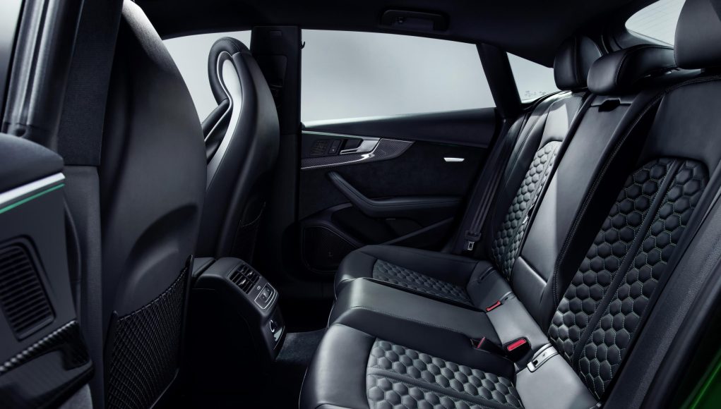Con un acabado en color negro, el habitáculo del Audi RS 5 Sportback cuenta con un amplio equipamiento funcional y ofrece espacio para cinco ocupantes. Detalles como los asientos deportivos RS tapizados opcionalmente en cuero nappa fina y el volante deportivo multifunción RS con su parte inferior plana acentúan el carácter deportivo del coupé de cinco puertas de altas prestaciones.
