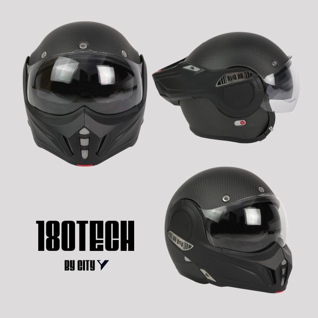 Casco modular 180Tech, para los que buscan un casco más amable en el día a día, fabricado en fibra de carbono, con visor solar incorporado y ventilaciones en mentonera y frente. Materiales que ofrecen una alta resistencia a los impactos y una gran ligereza, con un peso de 1400gr. Precio: 352,99€ (Tallas: XS-XL).
