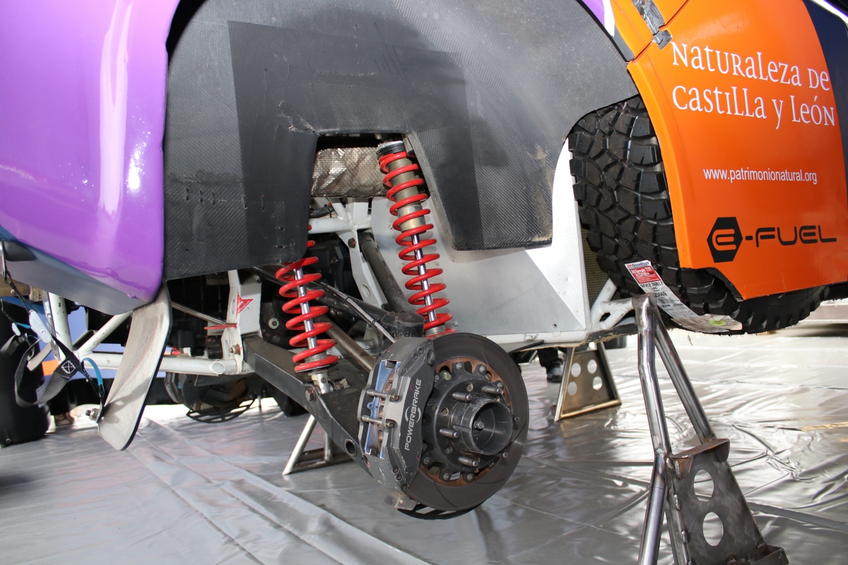 Todo el chasis está diseñado para soportar la dureza del Dakar y sortear con eficacia los obstáculos de su recorrido. Para ello cuenta con unos impresionantes neumáticos BF Goodrich de 37 pulgadas de diámetro (con sistema de inflado/desinflado con control electrónico) y con unas suspensiones de doble horquilla con un impresionante recorrido de 440 mm.