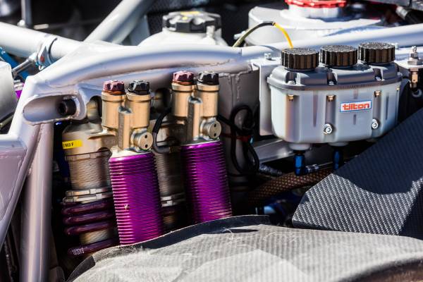 La suspensión se debe a los especialistas Reiger Racing Suspension. Cada eje funciona con cuatro unidades de suspensión completamente ajustables (dos por rueda) que le otorgan el recorrido de 250 mm permitido. Los discos de acero autoventilados de 320 mm incluyen pinzas de seis pistones. Para asegurar un excelente frenado que resista a la presión de las condiciones de la carrera durante horas a altas temperaturas, las pinzas de freno traseras están refrigeradas con aire y agua.