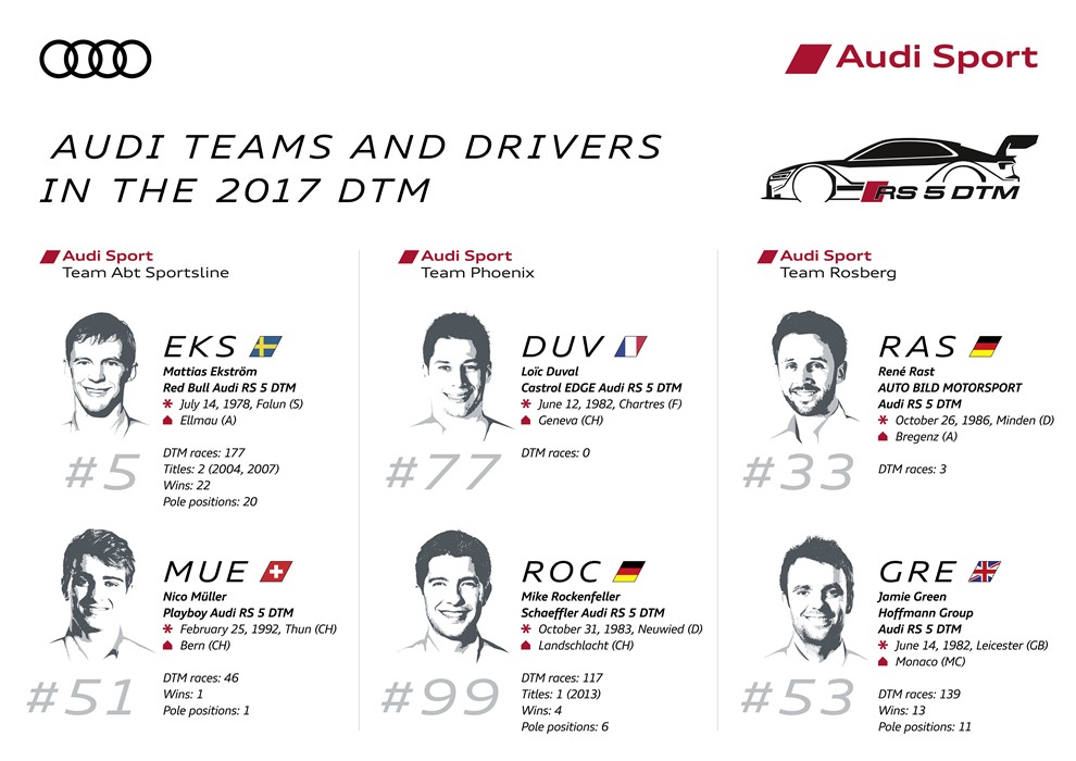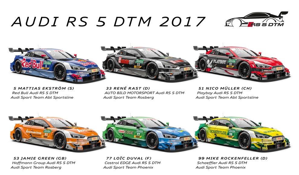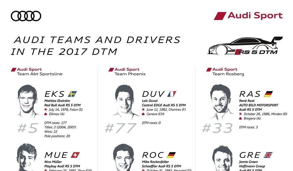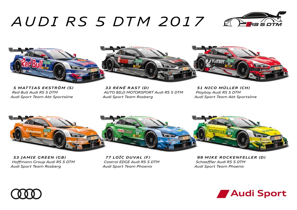Los tres equipos de Audi Sport, Abt Sportsline, Phoenix y Rosberg, pusieron a punto los seis coches en las últimas semanas. Los controles finales y la inspección de calidad se llevaron a cabo en las instalaciones de Audi en Neuburg antes de que los coches aparezcan por primera vez en pista ante el público el próximo viernes día 5 de mayo, en las sesiones de entrenamientos libres que darán comienzo a las 17:00 h. Las dos primeras carreras del DTM que dan inicio a la temporada tendrán lugar el sábado 6 de mayo a las 14:45 horas (CEST) y el domingo 7 de mayo a las 15:15 horas. Como en todas las carreras del DTM durante la temporada 2017, la cobertura en directo en “Das Erste” comenzará 15 minutos antes del inicio de cada carrera.