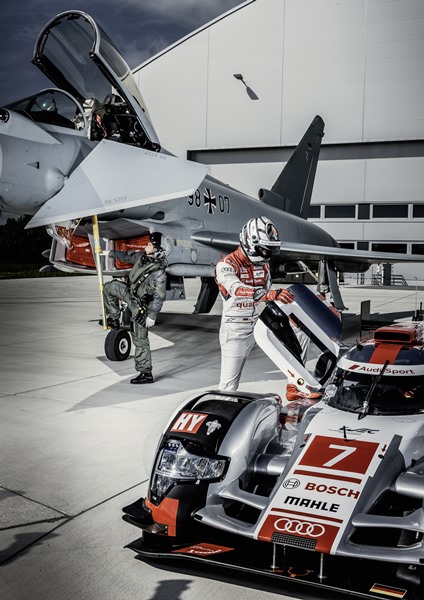 Giros a gran velocidad y con elevadas fuerzas g, fortísimas aceleraciones y concentración absoluta; así es el día a día André Lotterer y Geri Krähenbühl, el primero piloto oficial de Audi en el Campeonato del Mundo de Resistencia y en las 24 Horas de Le Mans y el segundo piloto de pruebas del Eurofighter Typhoon, dos hombres acostumbrados a vivir siempre al límite.
