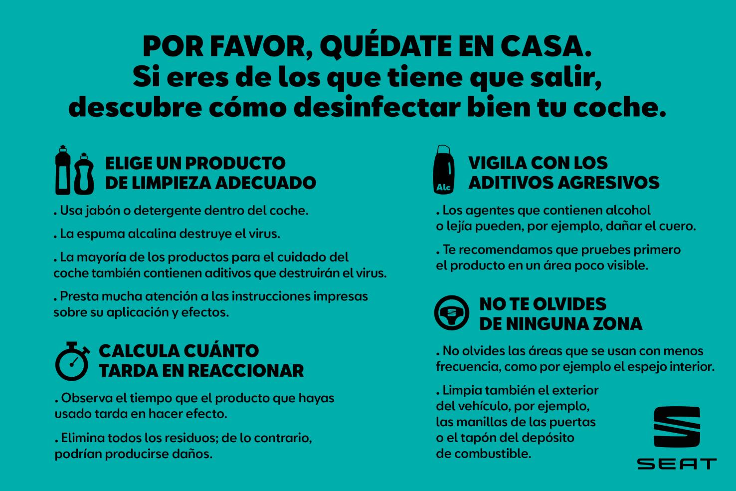 Exterior. Aunque no nos damos cuenta, manipulamos muchas zonas exteriores del coche, además de las manillas. Nos apoyamos en ventanas, abrimos sujetando el marco o cerramos empujando las puertas. Es importante utilizar losproductos adecuados: agua y jabón, productos específicos para el cuidado del coche y, en menor medida, líquidos que contengan un 70% de alcohol.
