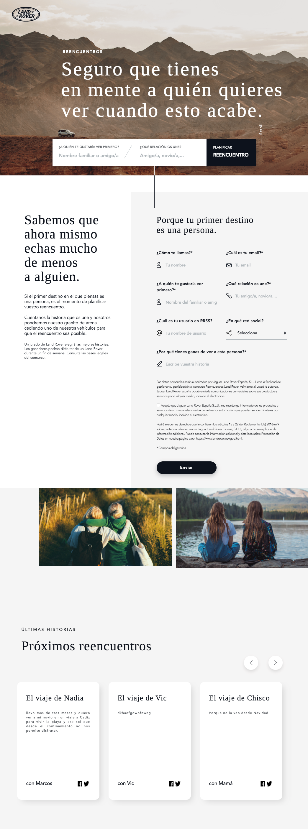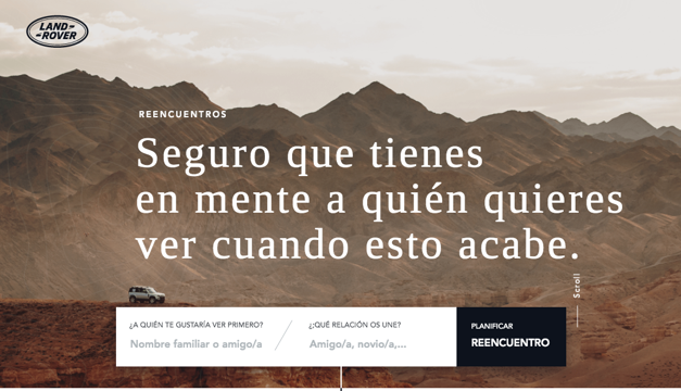 Si el primer destino en el que piensas para cuando todo esto pase es una persona, este el momento de planificarlo todo. En Land Rover queremos conocer la historia que os une a ti y a esa persona especial para poder aportar nuestro granito de arena cediendo uno de nuestros vehículos y hacer así que ese reencuentro sea posible.