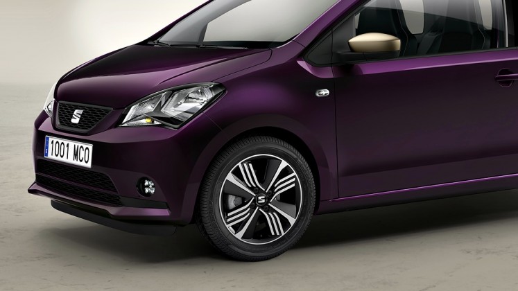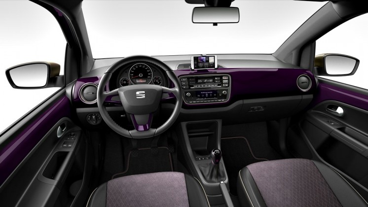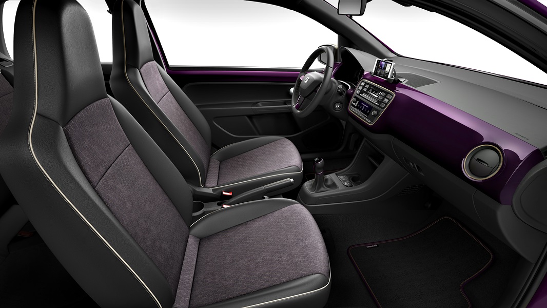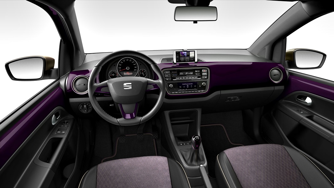 El acabado Bismuth champagne de los espejos retrovisores exteriores se refleja en los detalles interiores, así, en las salidas de aireación, los marcos del sistema de infoentretenimiento y en las costura del interior del coche, incluyendo las alfombrillas. Los asientos están tapizados en Alcantara® violeta de alta gama alta, una tapicería de calidad superior con un excelente acabado; el techo está tapizado en tonos oscuros, proporcionando una sensación de glamour. Hay unas estriberas de aluminio en las puertas delanteras con la leyenda “COSMOPOLITANlovesMii”. Los detalles cromados interiores son mate, con la excepción del logotipo de SEAT que se encuentra en el volante.