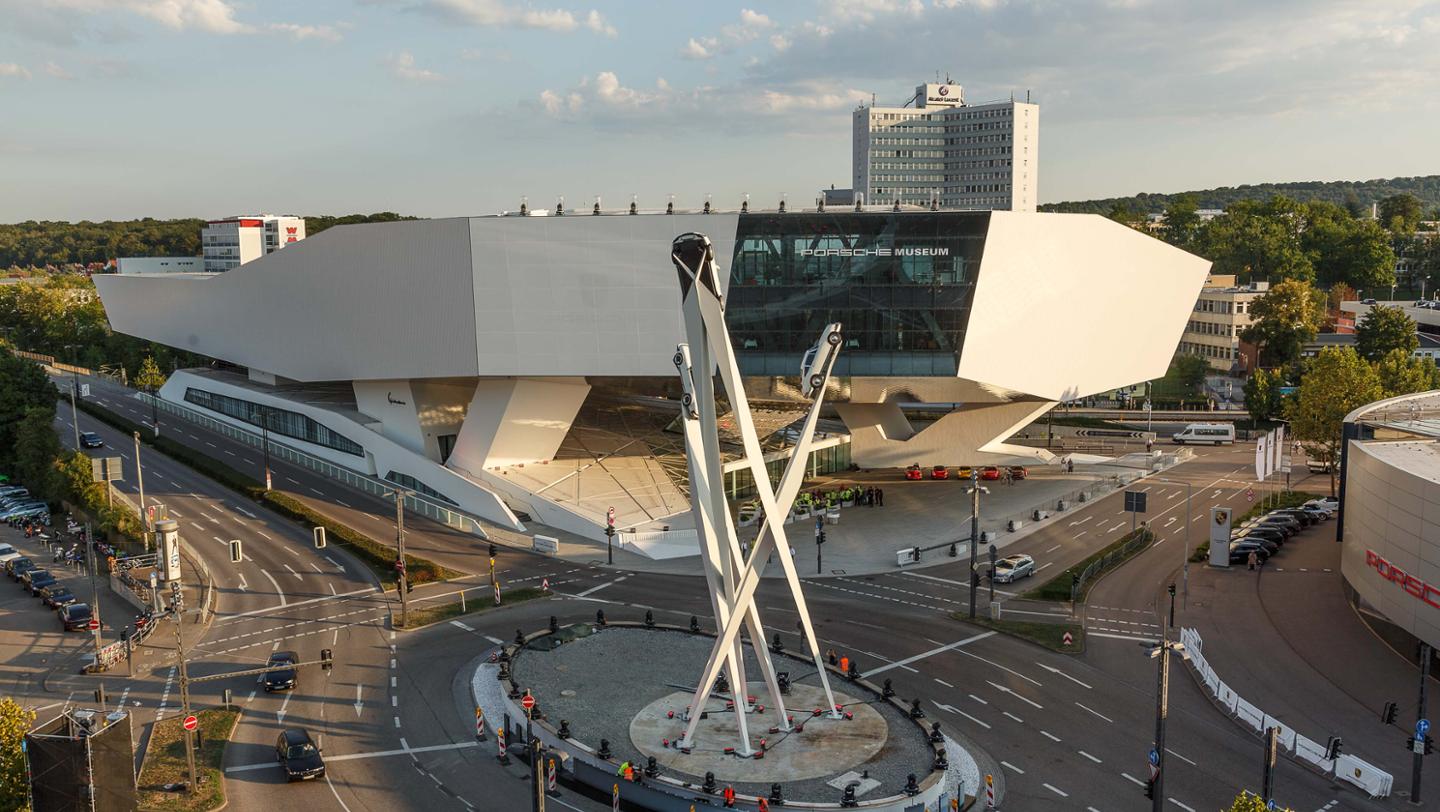 El corazón de Porsche late en Zuffenhausen. Fue aquí donde el primer 911 salió de la línea de montaje en 1963. Ningún otro deportivo despierta tanta fascinación, ningún otro vehículo emociona tanto a los entusiastas del automóvil en el mundo entero. Es la esencia de la marca Porsche. Inspirándose en su herencia, el artista británico Gerry Judah ha creado una gran escultura, que consiste en tres pilares que suben a una altura de 24 metros y que están coronados por sendos Porsche 911 en sus extremos. Los vehículos corresponden a diferentes generaciones del 911, como homenaje a la historia de este automóvil clásico. La escultura, situada en la Porscheplatz, se convertirá en el nuevo punto central para los visitantes de todo el mundo.