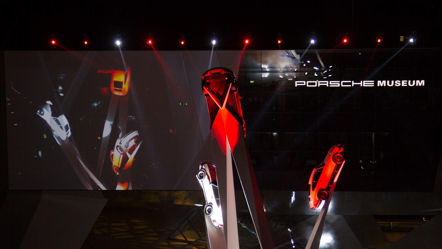 La presentación pública de esta escultura titulada “Inspiración 911” se hizo ayer por la tarde. Preparada específicamente para la ocasión, la Porscheplatz ofrecía un aspecto impresionante. El espectáculo se componía de una combinación luces, imágenes y coreografía de vehículos. Con la fachada de cristal del Museo Porsche utilizada como pantalla, las imágenes se proyectaban en un espacio superior a los 200 metros cuadrados. Entre los coches en movimiento que se desplegaron se encontraban también los componentes de esta obra de arte: un modelo de la serie F de 1970, otro de la serie G de 1981, así como la última generación del 911. Los espectaculares efectos de luces, utilizando la especial arquitectura del museo, fascinaron a los asistentes. Como colofón, se mostró la gama actual de Porsche a los espectadores que acudieron al evento.
