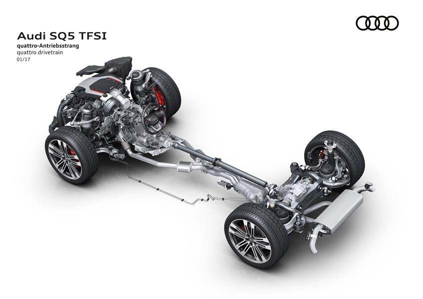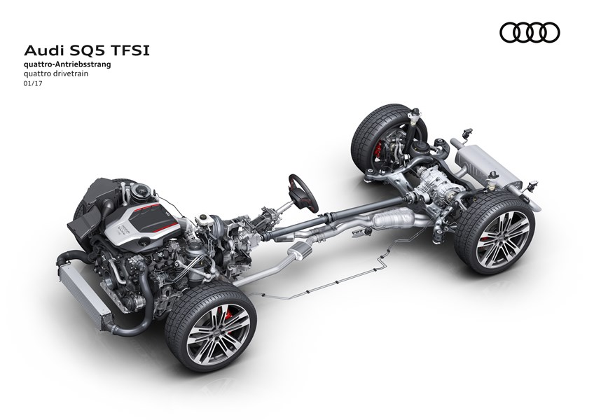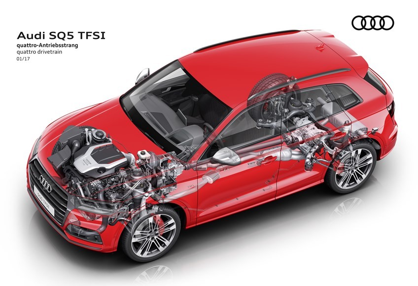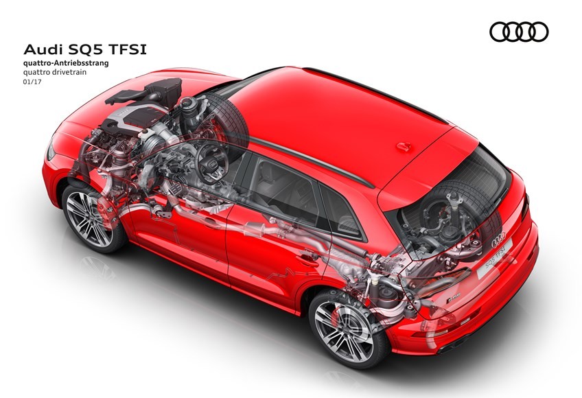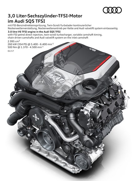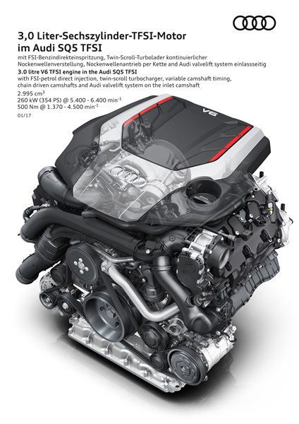 El Audi SQ5 equipa un motor V6 TFSI de 2.995 cc con una potencia de 354 CV (260 kW). Fabricado en aluminio, el motor turboalimentado entrega un par constante de 500 Nm entre 1.370 y 4.500 rpm. La aceleración de 0 a 100 km/h se completa en 5,4 segundos, mientras que la velocidad máxima está limitada electrónicamente a 250 km/h. En el ciclo NEDC, el nuevo Audi SQ5 3.0 TFSI consume sólo 8,3 litros de combustible cada 100 km, lo que equivale a unas emisiones de CO2 de 189 g/km. Comparado con su predecesor, esto supone una reducción de 13 g/km.