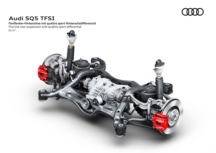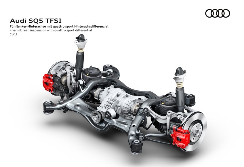 El diferencial deportivo opcional optimiza aún más la respuesta al volante mediante la distribución activa del par en las ruedas traseras a través de dos etapas de superposición. Envía más par a la rueda exterior cuando se acelera en curvas de radio particularmente cerrado, haciendo que el SQ5 se muestre aún más ágil. El diferencial deportivo empuja literalmente al coche en la curva, eliminando el subviraje. Su gestión está integrada en el sistema Audi drive select, y se ejecuta a través de la unidad central de control, la plataforma de chasis electrónico.