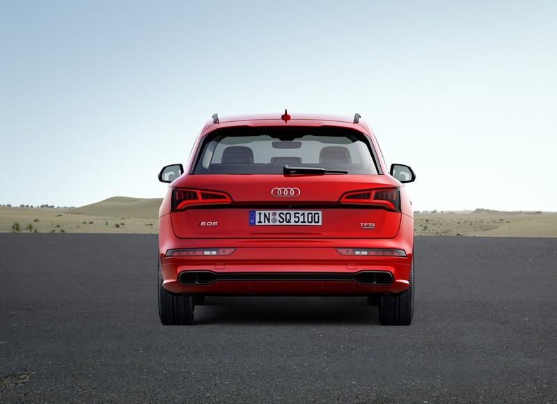 La tecnología LED es de serie para todas las funciones de iluminación, y los intermitentes dinámicos aseguran una gran visibilidad para el resto de los conductores. En los laterales del vehículo, la carcasa de los espejos retrovisores en aluminio y las molduras en las puertas en el color de la carrocería acentúan el carácter deportivo. El paragolpes trasero integra la doble salida de escape S y una terminación en aluminio para el difusor. El color negro pantera se reserva en exclusiva para el nuevo Audi SQ5.